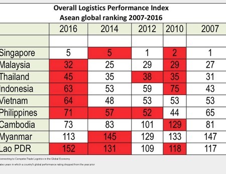 Singapour a été placée comme plaque tournante logistique de l’Asie pour la dixième année consécutive selon le rapport de l’indice de performance logistique de la Banque mondiale (rapport LPI 2016) et a vu le classement chuter du Cambodge et du Myanmar. Il est à croire queles économies émergentes qui mettent en œuvre des initiatives globales continuent d’améliorer leurs performances.