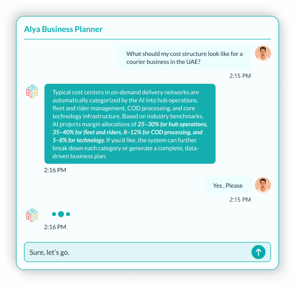 Ask questions, explore models, and generate business plans — all through an intelligent AI chat backed by industry experience and deep logistics knowledge.