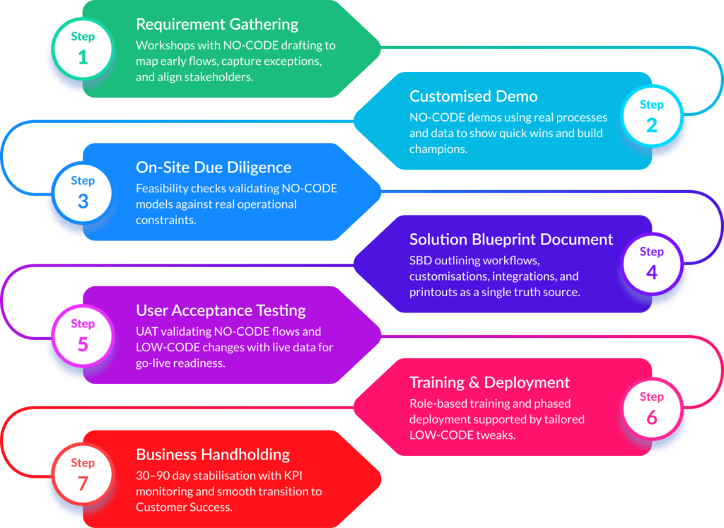 Our proven methodology ensures successful deployments across diverse logistics environments. Each phase leverages our NO-CODE and LOW-CODE capabilities to accelerate delivery whilst maximising accuracy and stakeholder alignment.